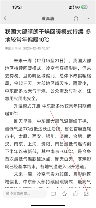 3、在資訊詳情頁閱讀內容,了解天氣相關信息,找到頁面下方的分享按鈕,點擊觸發分享選項彈窗。