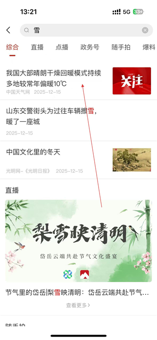 2、登錄后在搜索框輸入雪,點擊搜索按鈕,查看綜合分類下的相關資訊內容,選擇目標資訊進入詳情頁面。