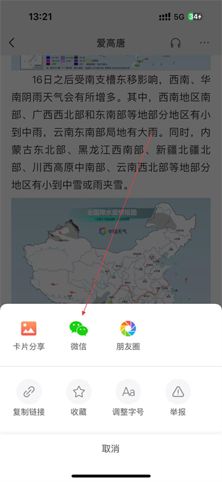 4、在分享彈窗中選擇微信等渠道,按照提示完成,可將該天氣資訊內容分享給朋友。