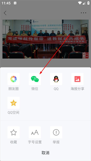 4、在資訊詳情頁面點擊分享按鈕,選擇朋友圈微信等分享渠道,也可進行收藏字號設置等。