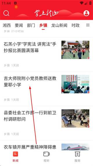 1、打開掌上龍山軟件,進入鄉鎮板塊的資訊列表,瀏覽展示的資訊內容,選擇感興趣的資訊條目,點擊即可進入該資訊的詳情頁面查看內容。