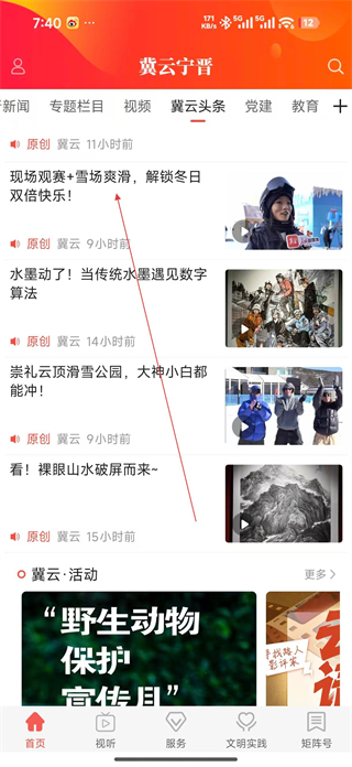 2、登錄后進入首頁瀏覽新聞專題欄目等分類,查看冀云頭條下的資訊列表,選擇感興趣的資訊標題,點擊進入該資訊的詳情頁面。