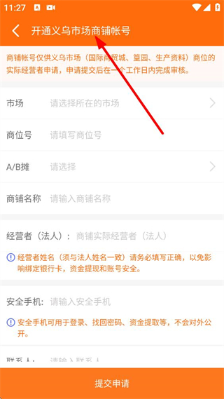 3、若要開通義烏市場商鋪帳號,需選擇所在市場、填寫商位號等信息,提交申請后一個工作日內完成審核,供市場實際經營者申請。