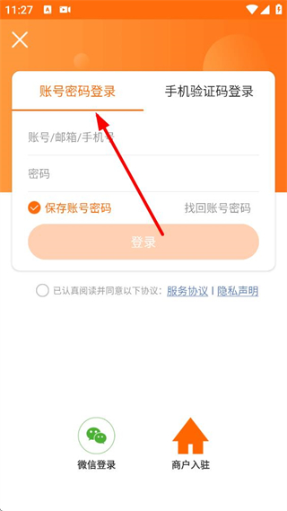 1、打開義烏市場APP,可選擇賬號密碼登錄,輸入賬號、郵箱、手機號和密碼,勾選同意相關協議后點擊登錄,也可選擇微信登錄或商戶入駐。