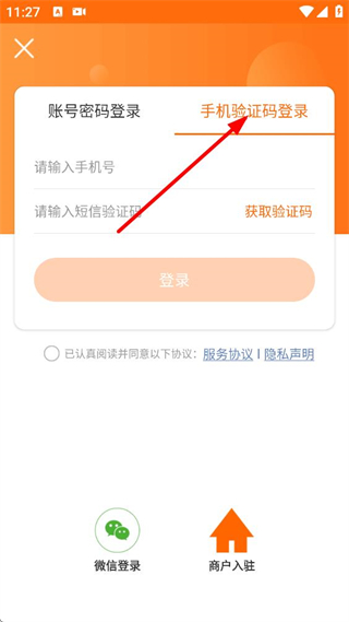 2、選擇手機驗證碼登錄方式,輸入手機號,獲取并輸入短信驗證碼,勾選同意相關協議后點擊登錄,方便快捷。