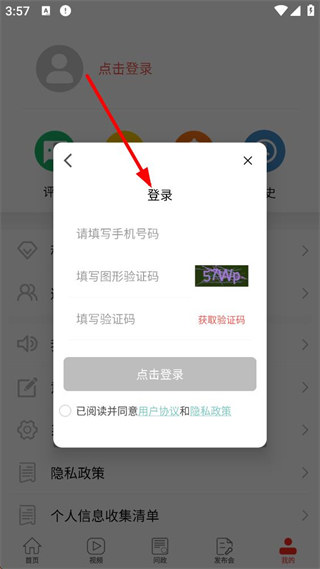 4、手機登錄界面需依次填寫手機號碼圖形驗證碼和短信驗證碼,勾選協議后點擊登錄按鈕,即可完成賬號登錄操作。