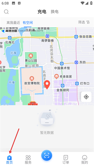 1、首頁,顯示充電換電設施地圖,當前區域暫無數據,可定位查找周邊充換電資源,助力車主便捷補能。