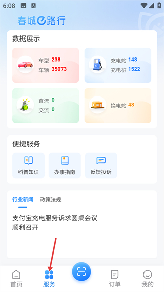 2、服務頁,展示車型充電樁等數據,提供科普辦事指南等服務,還推送行業資訊與政策法規內容。
