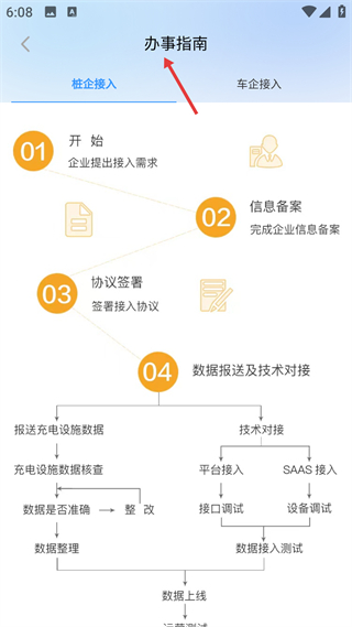 3、辦事指南,呈現政企車企接入平臺的四步流程,明確各環節操作,規范機構接入的具體步驟。