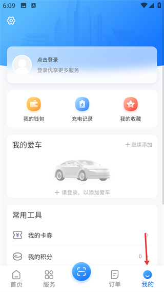 4、我的頁,需登錄使用,含錢包充電記錄等功能,支持添加愛車及管理卡券積分,是個人服務中心。