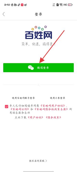 1、進入百姓網登錄頁面,可選擇微信登錄,登錄前需仔細閱讀并同意用戶協議和隱私政策,點擊微信登錄按鈕進行登錄。