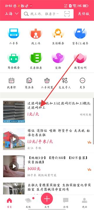 3、進入百姓網首頁可看到二手車、找工作等服務分類,還有各類服務信息推薦,點擊感興趣的服務進入詳情頁面。