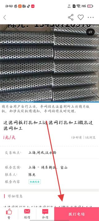 4、在服務詳情頁面可查看服務圖片、交易地點、聯系人等信息,點擊撥打電話可直接聯系咨詢。