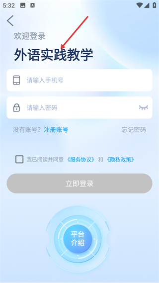 1、進入平臺先看到外語實踐教學的登錄界面,需輸入手機號和密碼,勾選相關協議后可點擊立即登錄,也能通過平臺介紹了解平臺信息。