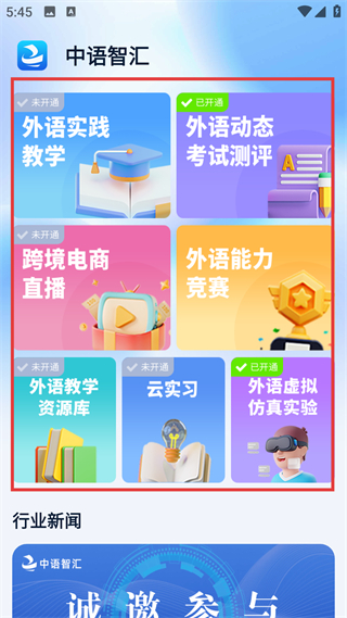 2、登錄后進入首頁,可看到外語實踐教學外語動態考試測評等功能模塊,部分模塊已開通,可選擇對應功能開展學習或操作。