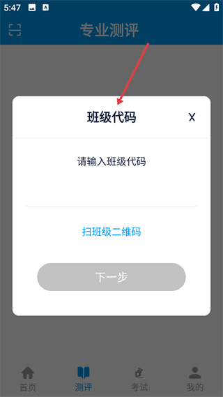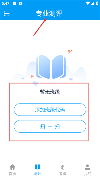 3、進入專業測評頁面,若顯示暫無班級,可通過添加班級代碼或掃一掃這兩個功能,關聯對應的學習班級以便參與測評。