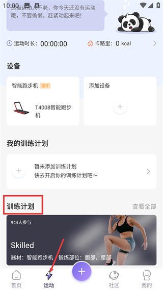 2、進入運動界面,看到運動時長統計與設備模塊,找到訓練計劃區域,可查看對應的訓練項目詳情。