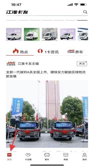 2、資訊頁展示多款江淮卡車,分熱點、資訊等板塊,推送駿鈴A系上市信息,是卡車用戶獲取品牌動態的渠道。