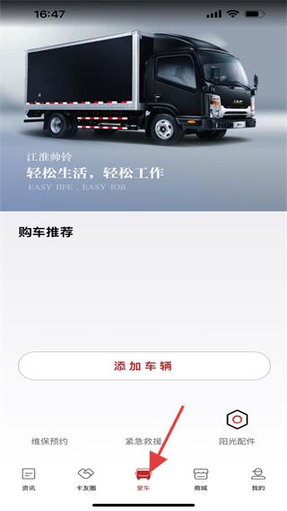 3、愛車頁展示江淮帥鈴,可添加車輛,提供維保、救援、配件服務,是卡車用戶管理車輛的功能頁面。