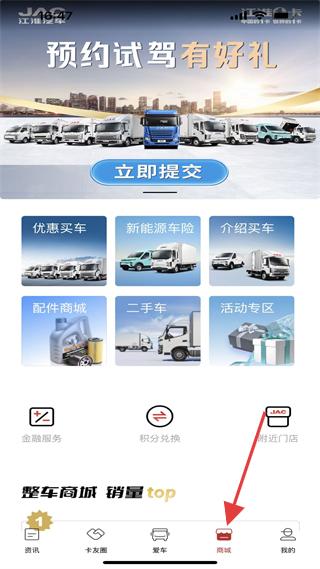 4、商城頁推試駕福利,含購車、車險、配件等服務,設二手車、活動區,覆蓋卡車用戶消費與服務需求。