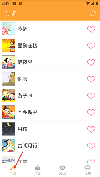 1、唐詩頁面列靜夜思詠鵝等多首唐詩條目右側配粉色心形收藏標識展示簡潔。