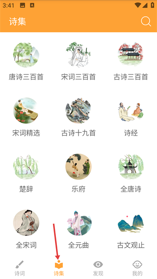 2、詩集頁,按體裁分類呈現唐詩三百首、宋詞精選等經典詩集,以國風插圖區分類別,方便按類型選擇詩詞內容。