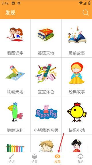 3、發現頁,提供看圖識字、英語天地等多類啟蒙功能,涵蓋故事、繪畫等板塊,豐富兒童的綜合啟蒙學習體驗。
