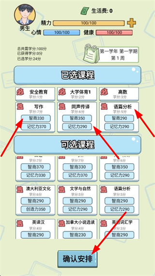 4、在可選課程里選擇寫作、同聲傳譯、語篇分析等課程,完成選課后點擊確認安排,確定本學期的課程表,推進大學生活模擬進程。