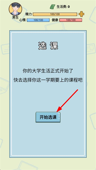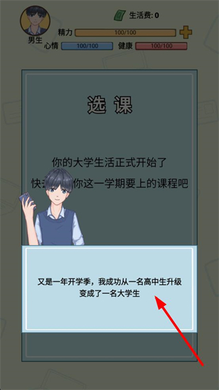 1、以男生身份開啟大學生活,從高中生升級為大學生,了解大學生活正式開始,即將進入選課環節。