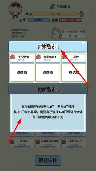3、查看選課規則,每學期需修讀至少4門至多6門課程,其中3門為必修課,還需自己選擇1到3門課,每門課程學分不同。