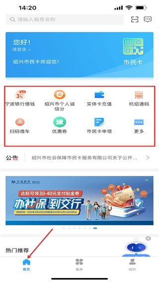 2、首頁聚合實體卡充值、掃碼借車等市民服務入口,同步展示公告與推廣信息,是紹興市民快速獲取服務的綜合主頁面。