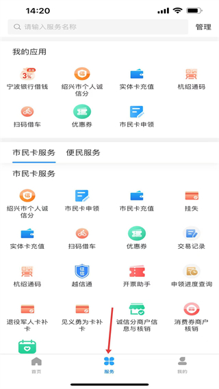 3、服務界面分類展示市民卡申領、充值等核心服務與便民服務,設我的應用快捷入口,是各類服務的集中導航頁面。