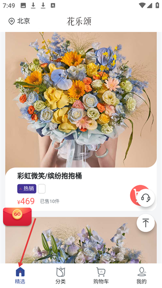 1、花樂頌精選頁展熱銷彩虹微笑抱抱桶,售價469元已售10件,底部有精選等功能入口,定位北京。