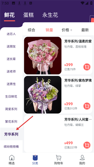 2、分類頁鮮花分類細,有送戀人等場景和芳華系列,芳華系列花束可按銷量排序,如溫柔的愛等售價399元。