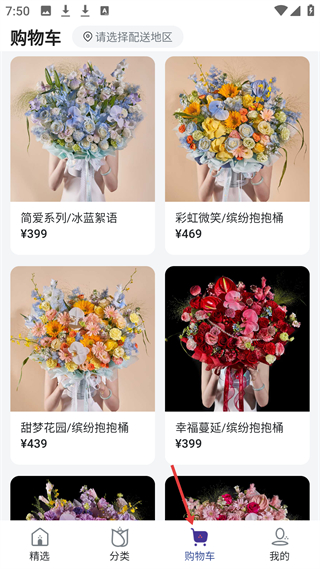 3、購物車頁有簡.愛冰藍絮語、彩虹微笑抱抱桶等多款花束,需選擇配送地區才能完成結算。