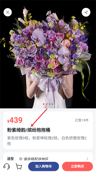 4、商品詳情頁是粉紫綺韻繽紛抱抱桶,售價439元含紫色玫瑰等花材,已售19件,可選配送地區后購買。