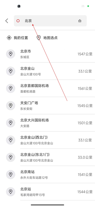3、在導航頁面的搜索框輸入北京,選擇目標地點如北京金山,確定該地點為目的地,準備生成前往該地點的路線。