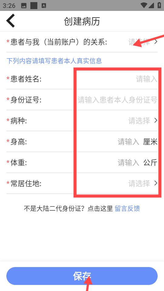 3、創建病歷界面需填寫患者關系姓名等信息,涵蓋身份病種等詳情,底部保存按鈕,幫助用戶規范錄入醫療數據,實現病歷數字化管理。