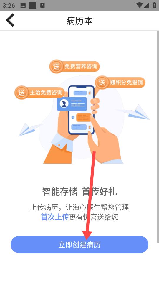 2、進入病歷本頁面展示智能存儲首傳好禮說明,強調上傳病歷可享營養咨詢等福利,藍色立即創建病歷按鈕突出,引導用戶開啟個人病歷建檔流程。