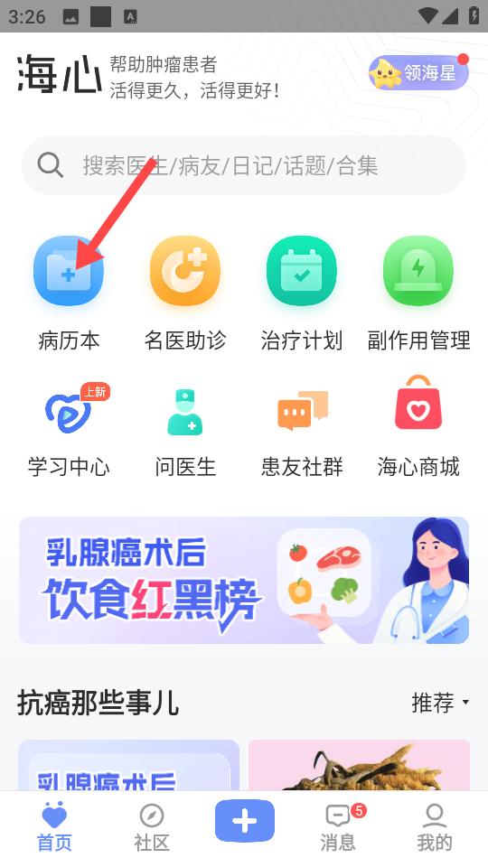 1、首頁設搜索欄下方列病歷本名醫助診等功能圖標,病歷本入口醒目,助力腫瘤患者管理醫療信息,頁面還展示抗癌知識與患友社群。