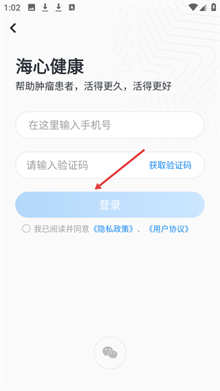 1、登錄板塊支持手機號驗證碼登錄,也可微信登錄,助力腫瘤患者開啟健康管理,使用APP各項功能。