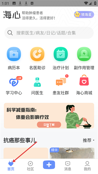 2、首頁有病歷本、名醫助診等功能,還有科學減重指南、抗癌資訊,助力患者治療與康復,功能豐富實用。