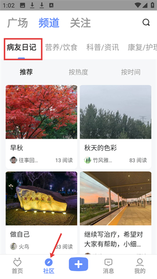 3、社區板塊有病友日記、營養飲食等頻道,病友分享生活與治療故事,營造互助氛圍,給患者情感支持。