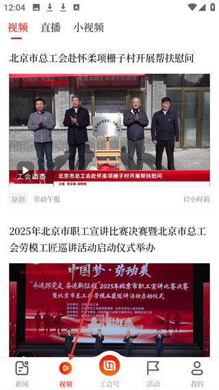 2、視頻板塊含直播等分類,推出市總工會赴懷柔幫扶慰問、職工宣講比賽決賽等視頻,以視聽形式呈現工會工作動態。