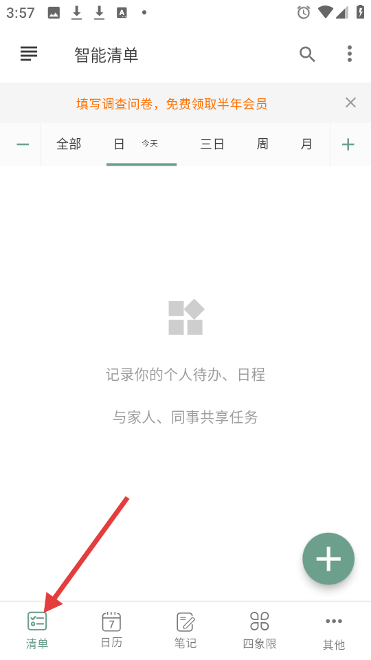 1、智能清單頁有問卷領會員活動,能記錄個人待辦,支持按時間查看還可與他人共享任務。