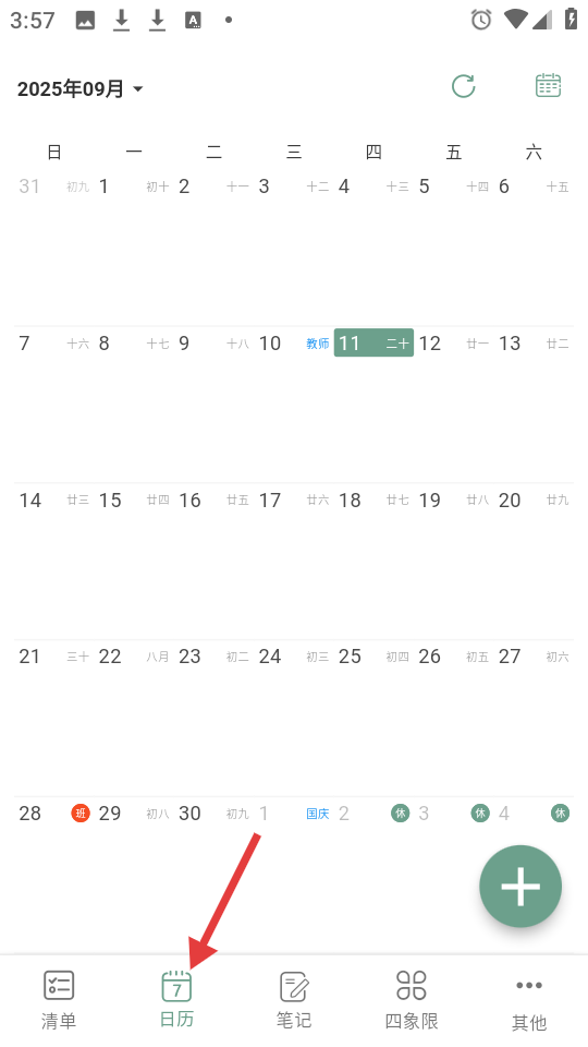 2、日歷頁面呈現2025年9月日期,含節日標注,底部日歷按鈕可快速進入助用戶掌握日程與日期信息。