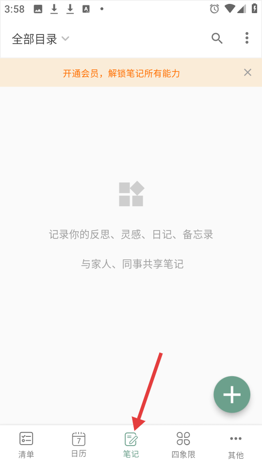 3、筆記頁面提示開通會員解鎖能力,可用于記錄反思、日記等,具備與家人、同事共享筆記的功能方便記錄靈感。