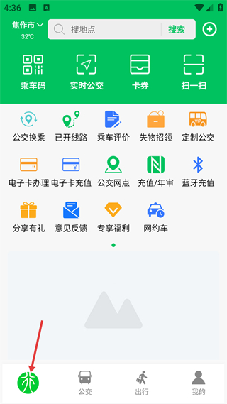1、進入首頁,可使用乘車碼實時公交等功能,通過公交換乘失物招領等入口,獲取本地公交的綜合服務。