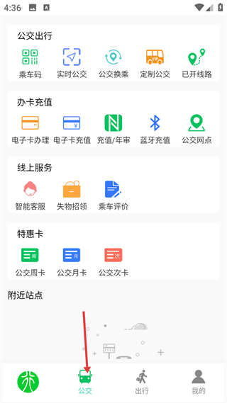 2、進入公交頁,可使用公交出行辦卡充值等功能,選擇周月次卡等特惠選項,查看附近的公交站點信息。