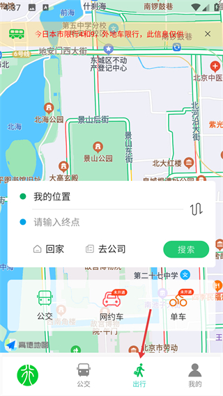 3、進入出行頁,可在地圖上選擇公交等出行方式,輸入起點終點查詢路線,獲取綜合的出行規劃服務。